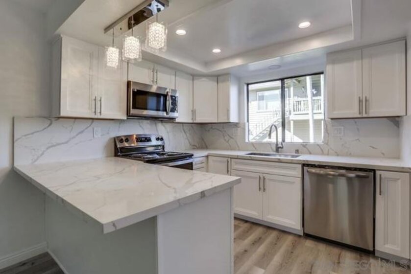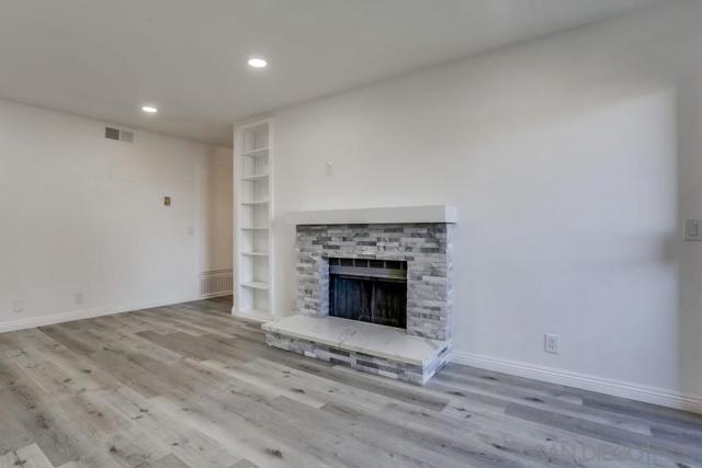 Newly Upgraded! Kitchen has quartz countertops, stainless steel appliances, new cabinets. Living room has a fireplace. Home has laminate wood flooring throughout and recessed lights. All bathrooms have been upgraded with new cabinets and tiled showers. Washer/Dryer in unit at the close area at the patio. You have your own garage and additional parking space. First floor unit with patio onto a well maintained complex.