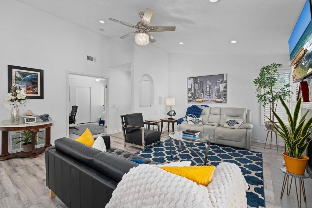 Situated in a desirable cul-de-sac neighborhood, this modernized gem offers both privacy and convenience, blending the charm of a patio home, with thoughtfully enhanced finishes throughout. Upon entry, the spacious living room is supported by gently pitched vaulted ceilings and a sleek fireplace. The tile and LVP flooring combination flows seamlessly into the open-concept living, kitchen, and dining areas, creating an exemplary space for both entertaining and everyday living. A true culinary haven, the kitchen features engineered stone counters with an embedded farmhouse double-basin sink, polished steel appliances, and soft-closing cabinetry with integrated illumination drawers. The recessed ceiling, fitted with canned LEDs and orbit pendant lights, extends over an expansive prep-and-serve island with bar seating. Equally impressive, the spacious guest and primary suites are complemented by resort-style baths, showcasing luxurious vanities and exquisite tile craftsmanship. Generously sized, the two-car garage offers a full workbench, equipped with built-in cabinetry and a large washer/dryer area with a commercial-grade sink. The freshly painted exterior features a privately shaded rear patio, two front storage enclosures, and a well-manicured, low maintenance landscape for optimal curb appeal. With the local library, schools, shopping, eateries, fire departments nearby, you'll enjoy easy access to all essential amenities with the benefit of a safe & welcoming community.