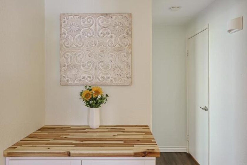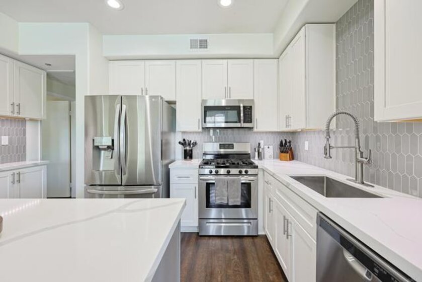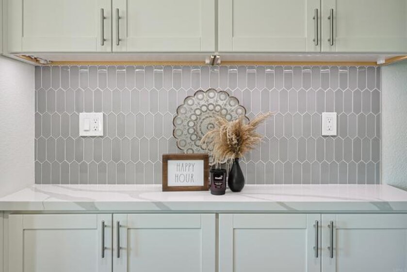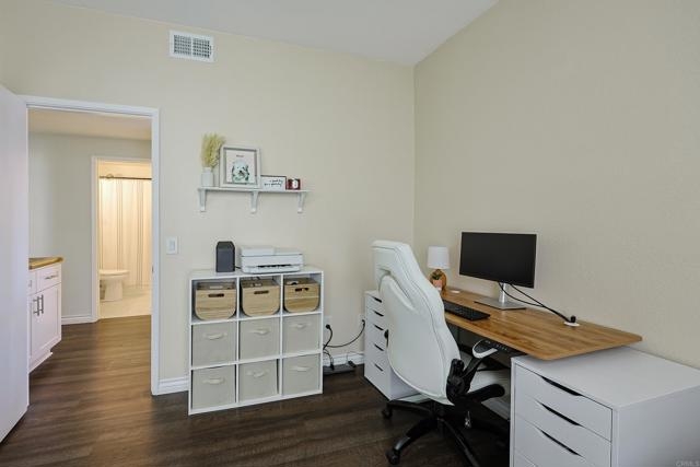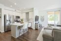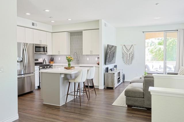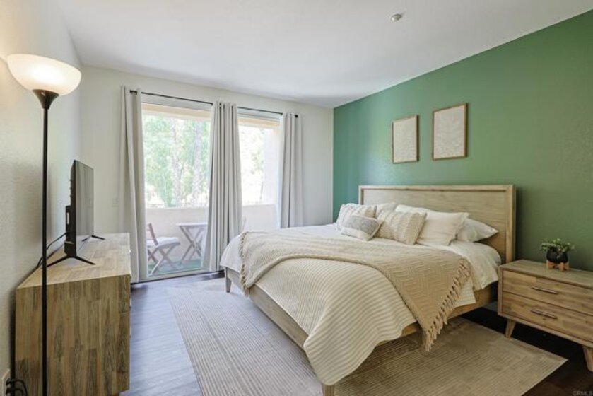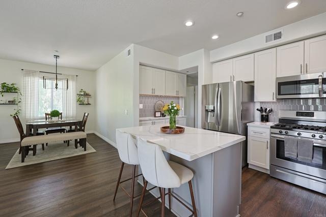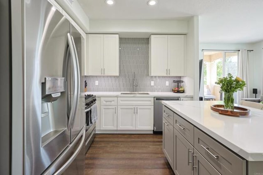 Beautifully updated 2 bed, 2 bath end unit in the gated community of Fairway Villas at Singing Hills Golf Course. This open-concept home features a completely renovated kitchen with quartz countertops, a large island, under-cabinet lighting, and a custom side bar—ideal for entertaining. The spacious layout includes 9-ft ceilings, recessed lighting, fresh paint, and updated flooring with 4" baseboards. The primary suite offers an updated bathroom and a walk-in closet with a new organization system. The guest bathroom has been tastefully refreshed, and a separate laundry room adds convenience. Two private balconies provide outdoor space, including one with a large storage closet. Smart home features include a Ring doorbell, keyless entry, and Nest thermostat. The one-car garage has room for a workbench and an extra refrigerator, plus there’s one assigned parking spot. Enjoy resort-style amenities including a community pool and spa, all in a peaceful golf course setting.