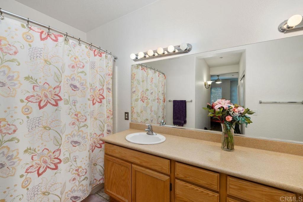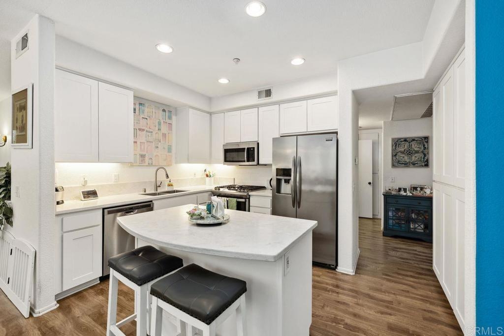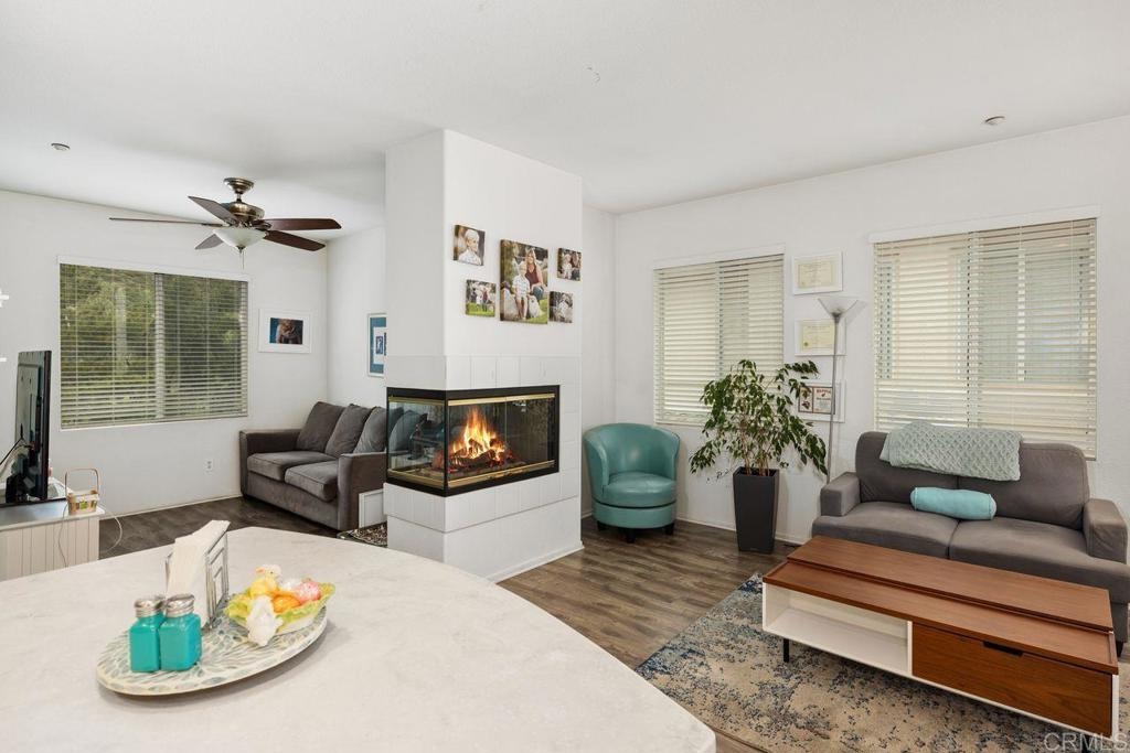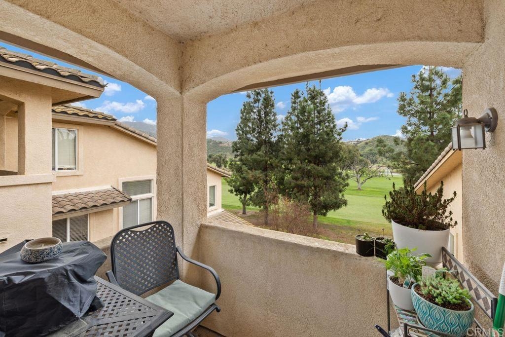 Welcome to the gated community of Fairway Villas, located near the Singing Hills Golf Course. This bright, open floor plan has plenty of natural light. The spacious kitchen features a large island, perfect for both meal prep and casual dining. The kitchen is beautifully designed with recessed lighting, stainless steel appliances, abundant cabinet space, and Hi-Mac countertops. The bathrooms feature Corian countertops. A cozy fireplace separates the living room and family room, creating distinct yet connected spaces. Step outside to the balcony off the living room, where you'll enjoy stunning views of the golf course. An additional private balcony is located off the main suite bedroom. This home offers a separate laundry room, an outdoor storage closet, 2 assigned parking spaces, ample guest parking and access to community amenities, including a pool and spa.