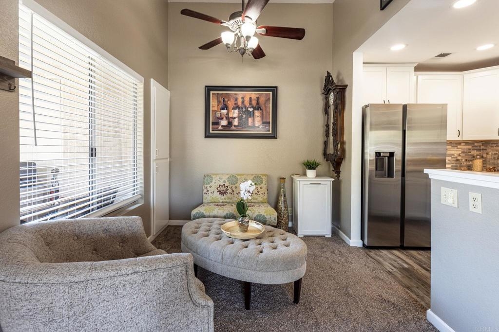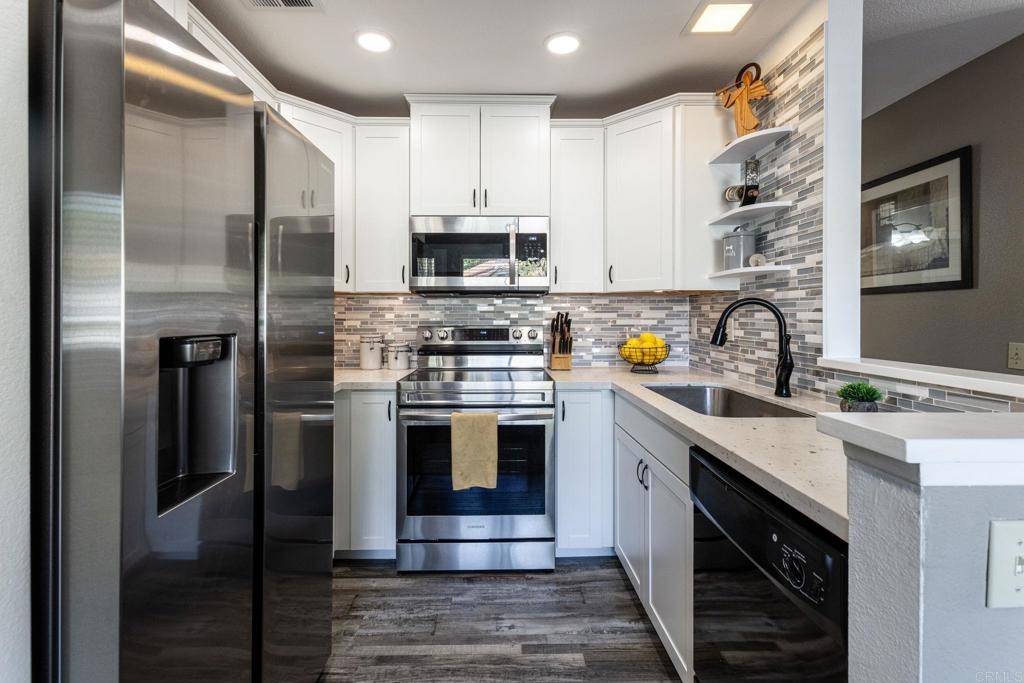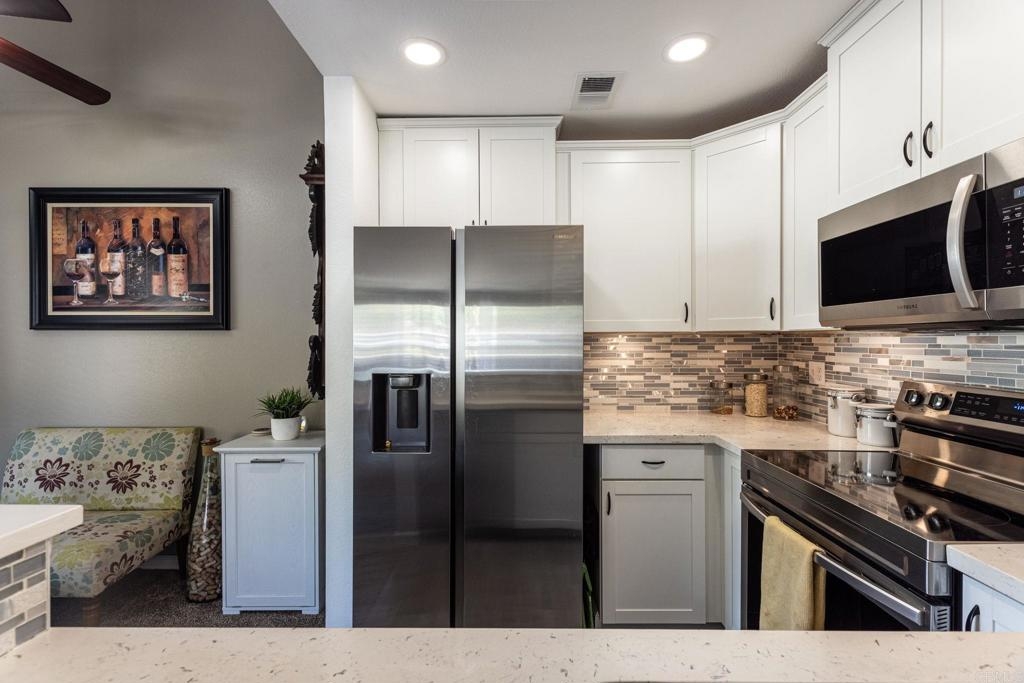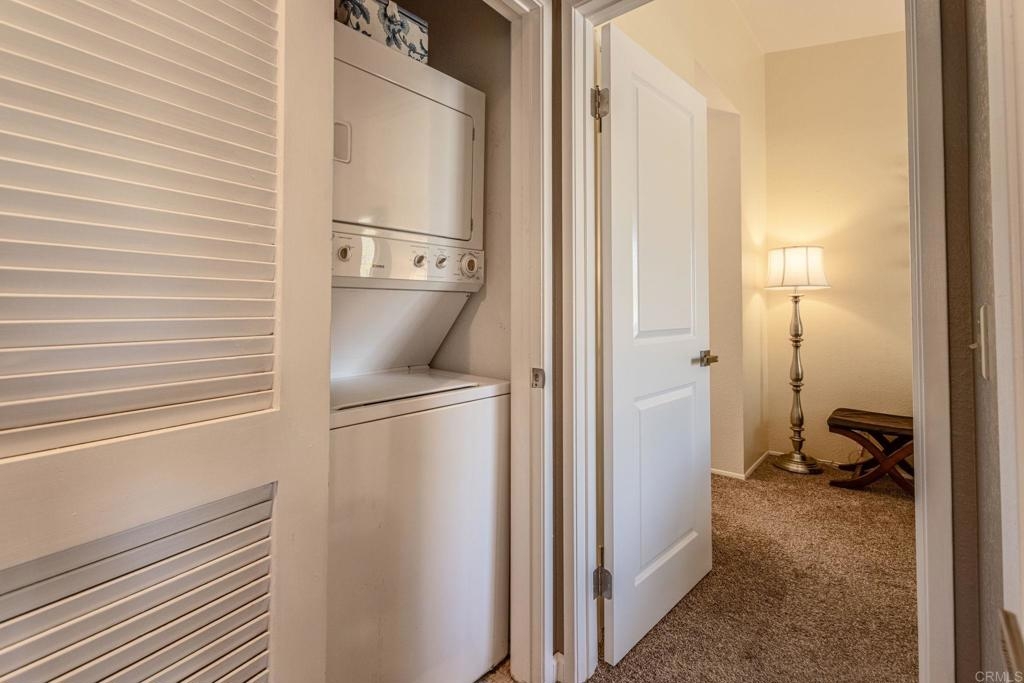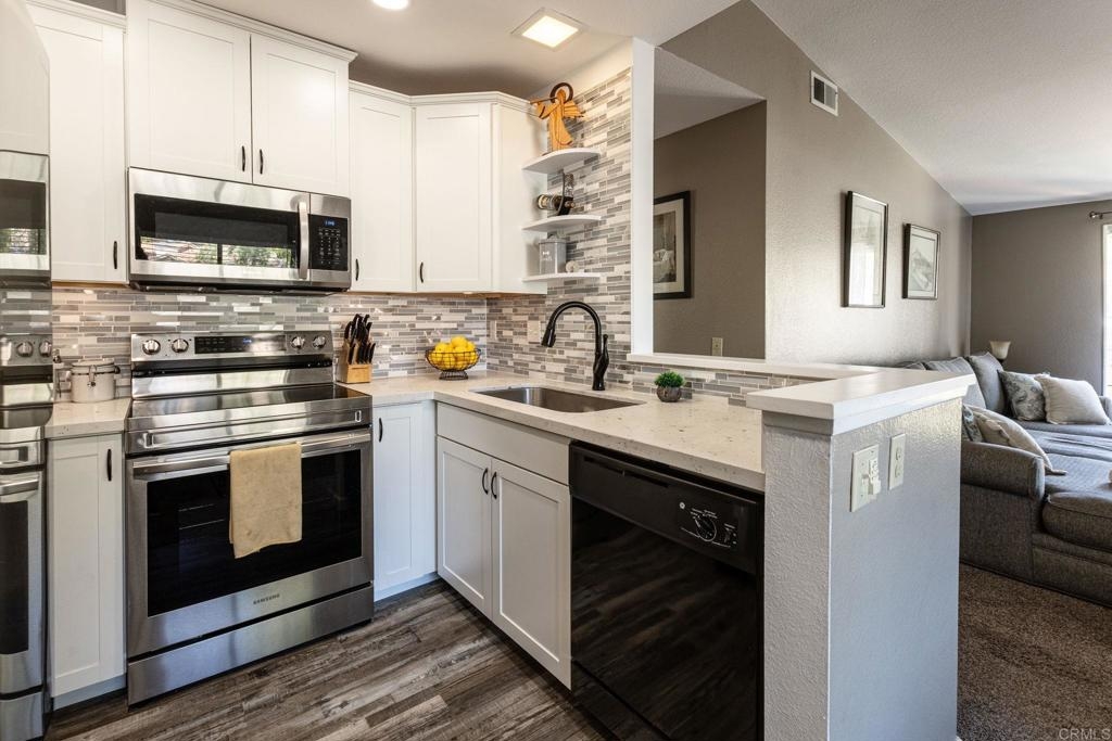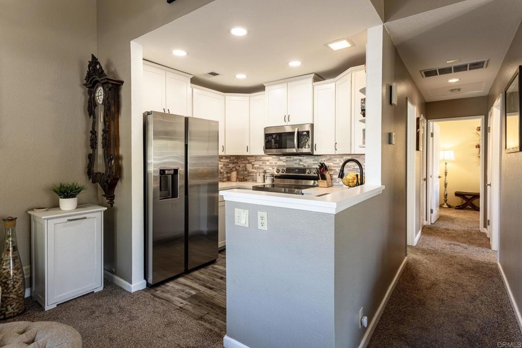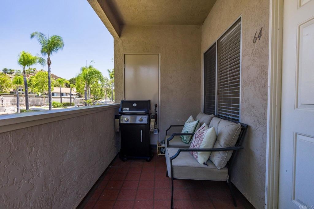 This charming 2 bed, 2 bath condo, in the much desired neighborhood of Rancho San Diego, offers the perfect blend of comfort and convenience. The kitchen has been tastefully updated with high-end finishes, including quartz countertops, white shaker-style cabinets, beautifully tiled backsplash and new stainless-steel appliances. The thoughtful design and high-quality materials create a warm, inviting atmosphere perfect for entertaining or everyday meal preparation. The vaulted ceilings in the living and kitchen area make the home feel open and spacious. The home features vinyl flooring in the kitchen and the bathrooms, providing a durable and easy-to-maintain surface that complements the modern aesthetic. Both bathrooms have been completely refreshed with gorgeous Bath Fitters shower/tub, new vanity in the guest bath and new sinks in both. New doors throughout the home add a fresh, cohesive look and feel, enhancing the overall sense of style and sophistication. Stay comfortable year-round with the newer air conditioning unit, ensuring a cozy and energy-efficient living environment. Enjoy one of the two private balconies, offering serene views and peaceful retreat, where you can sip a morning coffee or unwind after a long day. This unit comes with two covered carport spaces with added storage above the spaces. Nestled in a well-maintained, quiet complex, this home boasts an unbeatable location near shops, restaurants, and the 94 freeway, making it an ideal choice for those seeking an easily accessible lifestyle. Don't miss your chance to experience this exceptional condo. Schedule a showing today and make this your new home!