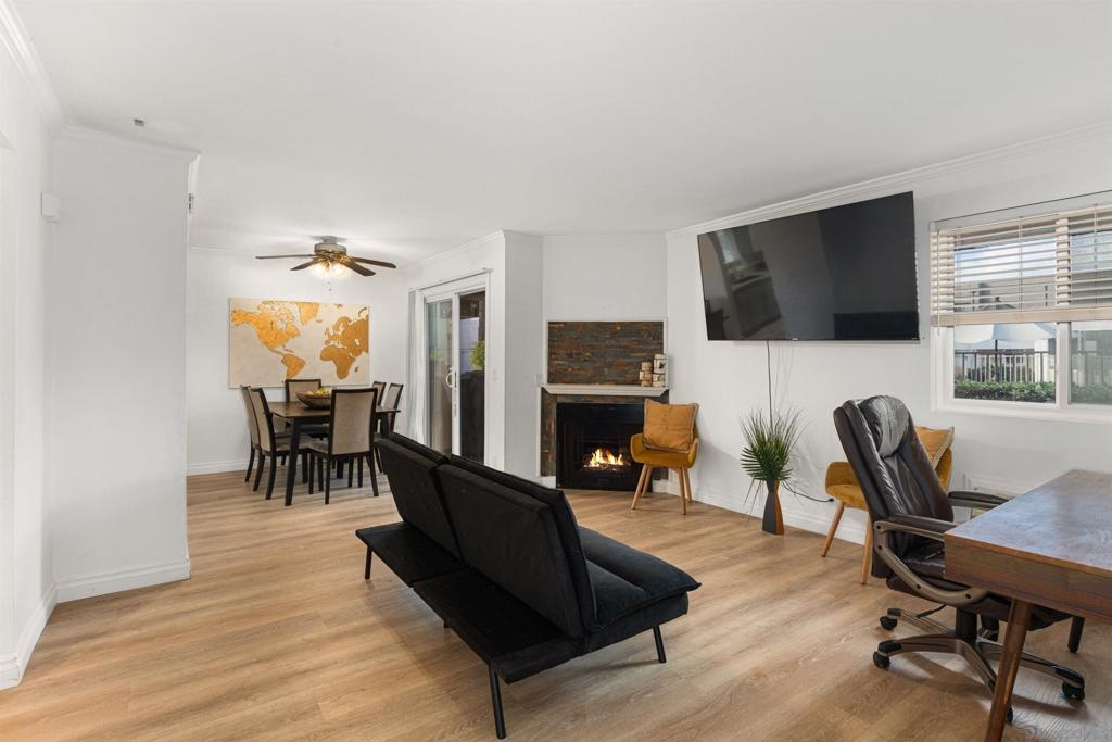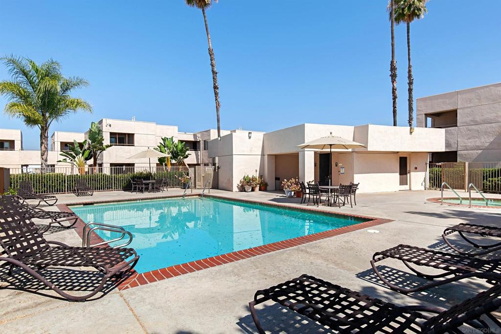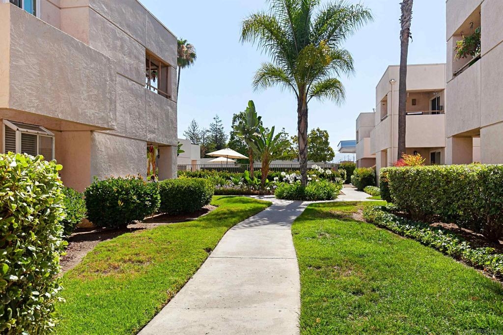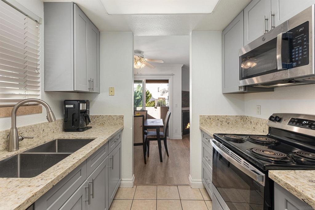 Beautiful corner condo at the Palm Court complex. Tucked away from the main street, this ground-level home boasts a generous living room with luxury vinyl plank flooring, a fireplace, and an adjacent dining area featuring a large patio sliding door. The remodeled kitchen features new cabinetry, granite counter-tops, and ss appliances. It also has two large bedrooms, a large soaking tub, a nice covered patio, a detached 1-car garage, and an assigned carport parking space. Enjoy all the community amenities, such as a pool, spa, exercise room, and pristine landscaping. The complex is VA approved, fully gated and secure, with a community laundry room. Ideally situated within walking distance to shopping, dining, freeways, and more!