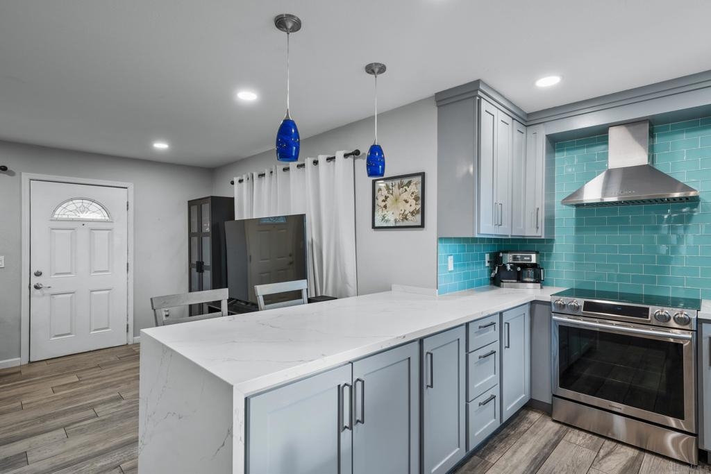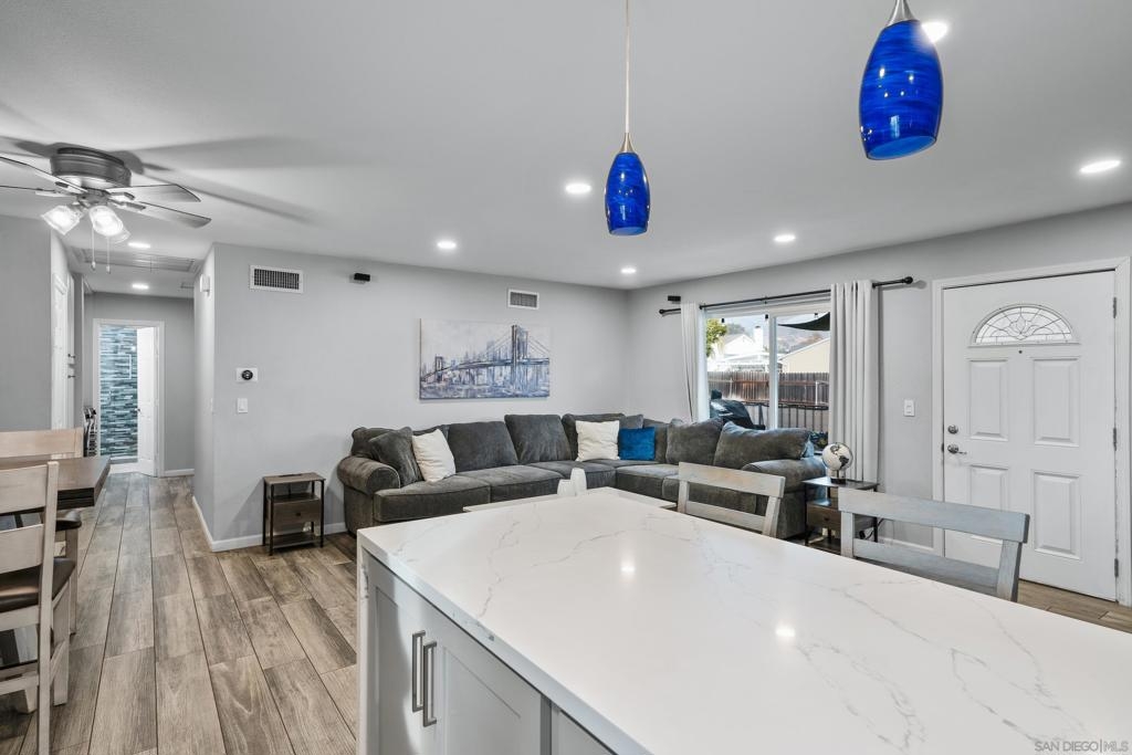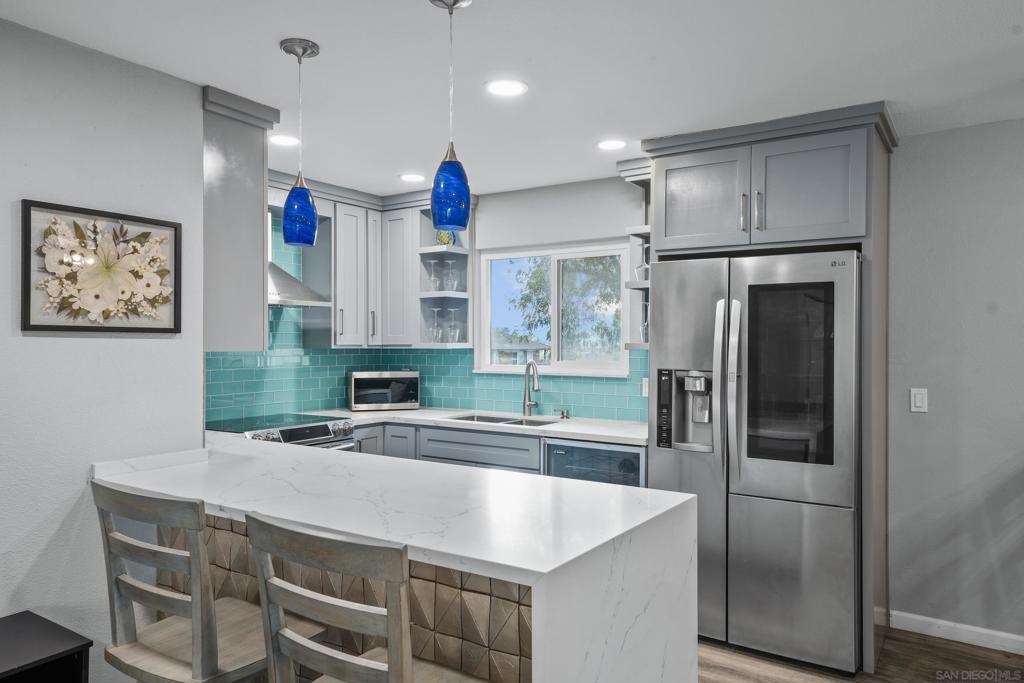A stunning home that's perfect for a first-time buyer! Reimagined from top to bottom with exquisite attention to detail. The interior features sleek Legno Italian porcelain tile floors complemented by plush new carpet in the bedrooms. The designer kitchen is a chef’s paradise, showcasing custom cabinetry, Carrara River Quartz countertops with a striking waterfall edge and hand painted tiles on the peninsula. The bathroom has been completely renovated and an updated laundry space combines style and functionality for everyday needs. Modern amenities such as recessed lighting throughout, a smart Nest thermostat and AC ensure comfort and efficiency at every turn. You'll also enjoy being an end-unit, the garage and 3 parking spaces total! The complex includes a pool and is VA approved!