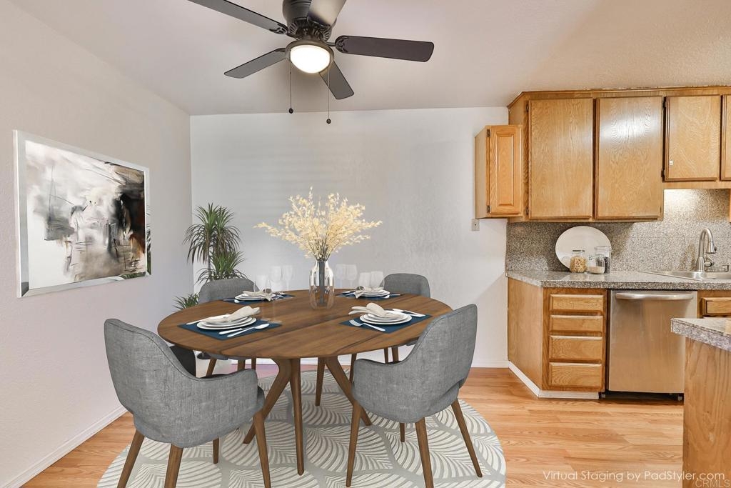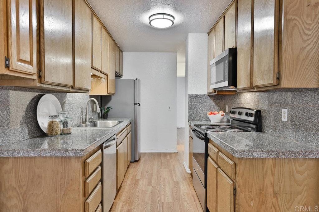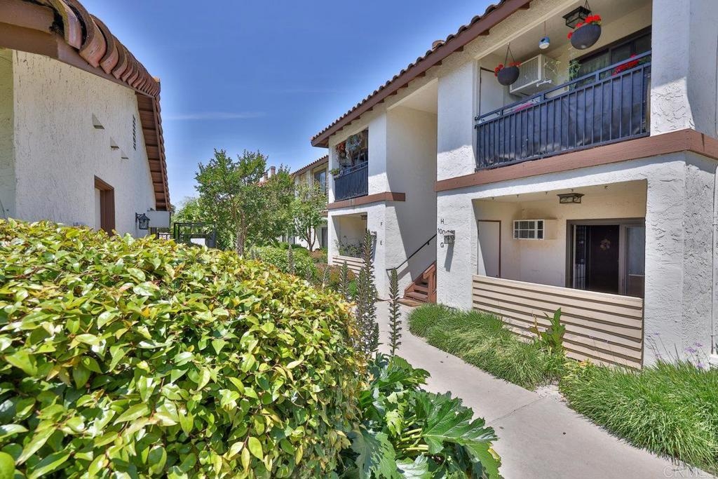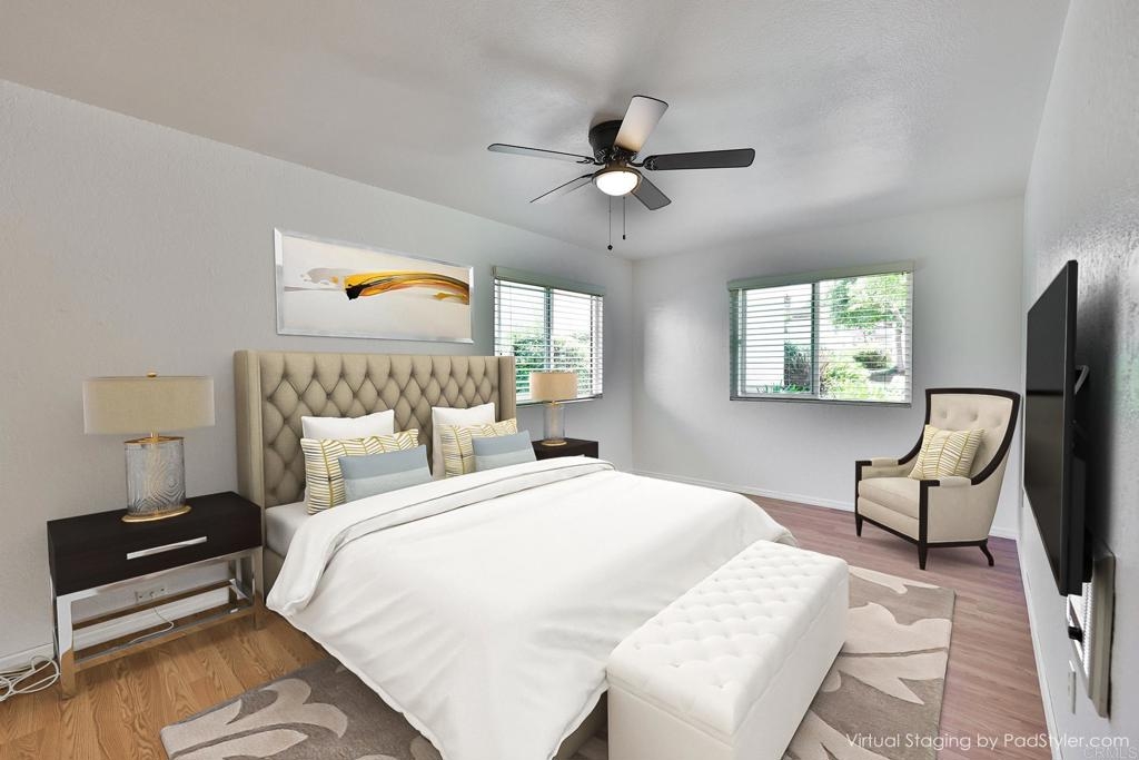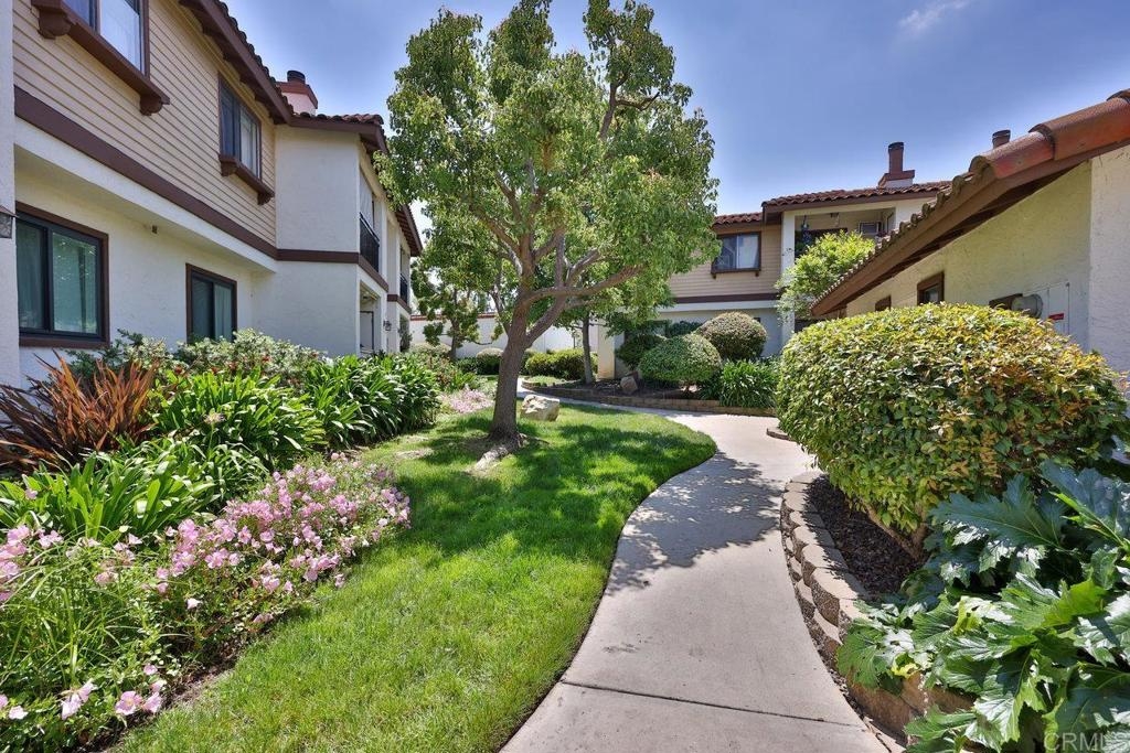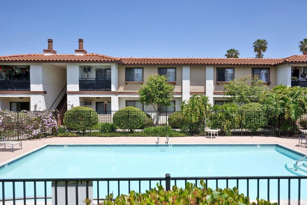 Welcome to Villa Serena Living! Step into serenity with this charming first-floor, 2-bedroom end unit nestled in the heart of Villa Serena. Boasting a coveted corner location, this residence invites you to experience both comfort and convenience. The spacious main bedroom features a walk-in closet and windows on two walls, flooding the room with natural light and offering picturesque views of the surrounding greenery. The kitchen is equipped with a brand new stove and microwave. The upgraded dual-pane vinyl windows and patio door ensure energy efficiency and tranquility, creating a peaceful retreat from the outside world. Unwind and enjoy the park-like views on your private patio, complete with additional storage space for your convenience. New ceiling fans throughout the home provide a gentle breeze on warm days, enhancing your comfort year-round. Indulge in the resort-style amenities of Villa Serena, including a beautifully landscaped complex and a sparkling community pool perfect for relaxation and recreation. With a single car garage featuring a remote opening door, as well as an extra assigned parking space, parking will never be a concern. Shopping, dining, community parks, as well as easy access to the freeways are all within minutes.