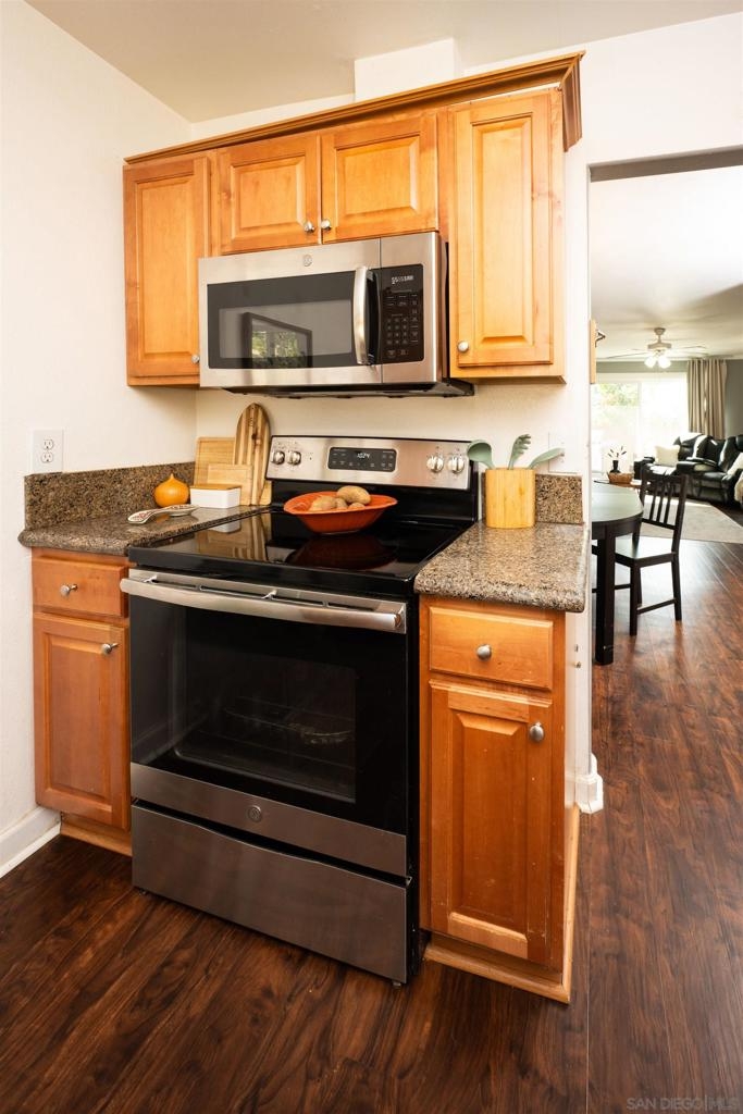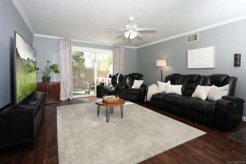 Welcome to this prime, single-level end-unit condo that lives more like a detached home. Thoughtfully upgraded throughout, this residence features luxury vinyl plank flooring installed approximately two years ago, along with solar, central A/C, newer windows, and updated slider doors that enhance comfort and energy efficiency.The kitchen offers granite countertops and includes a newer refrigerator. The washer and dryer, approximately two years old, are conveniently located in the private patio area. Both bathrooms have been tastefully updated.The home features a spacious, open-concept living and dining room combination, along with a wide entryway foyer. The primary bedroom includes an ensuite bath. Additional highlights include assigned covered parking with storage and a private backyard. Located in Winter Garden Village, a quiet, well-maintained community with park-like grounds, a community pool, and spa. Both bathrooms have been tastefully updated. The home features a spacious, open-concept living and dining room combination, along with a wide entryway foyer. The primary bedroom includes an ensuite bath. Additional highlights include assigned covered parking with storage and a private backyard. Located in Winter Garden Village, a quiet, well-maintained community with park-like grounds, a community pool, and spa.