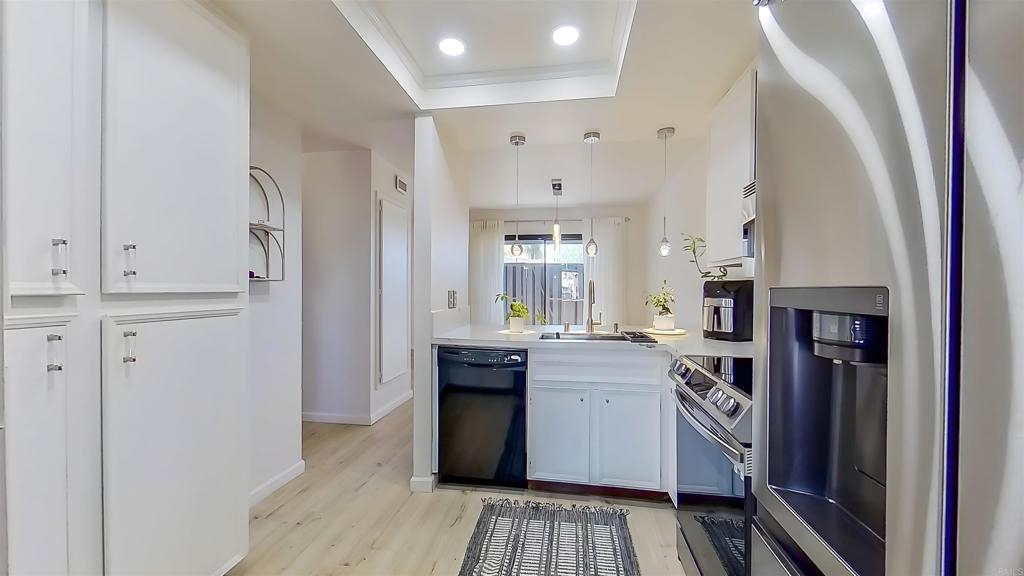 This townhome offers the perfect blend. Nestled in a peaceful setting with breathtaking greenbelt views, it boasts a welcoming ambiance. Step inside and discover a bright and airy haven featuring a brand new entry door. Vaulted ceilings add a sense of spaciousness, while the newly renovated kitchen impresses with stainless steel appliances, ample storage, and freshly painted cabinets. Luxury vinyl flooring flows seamlessly throughout, complemented by new carpeting on the stairs. Upstairs, natural light creates a tranquil atmosphere in the dual master bedroom suites, one featuring a recently updated bathroom. Convenience is key with laundry located in the direct-access garage, complete with new washer and dryer. Plus, enjoy easy access to shopping, dining, entertainment, and the freeway. This move-in-ready gem offers everything you need for a comfortable and stylish lifestyle.