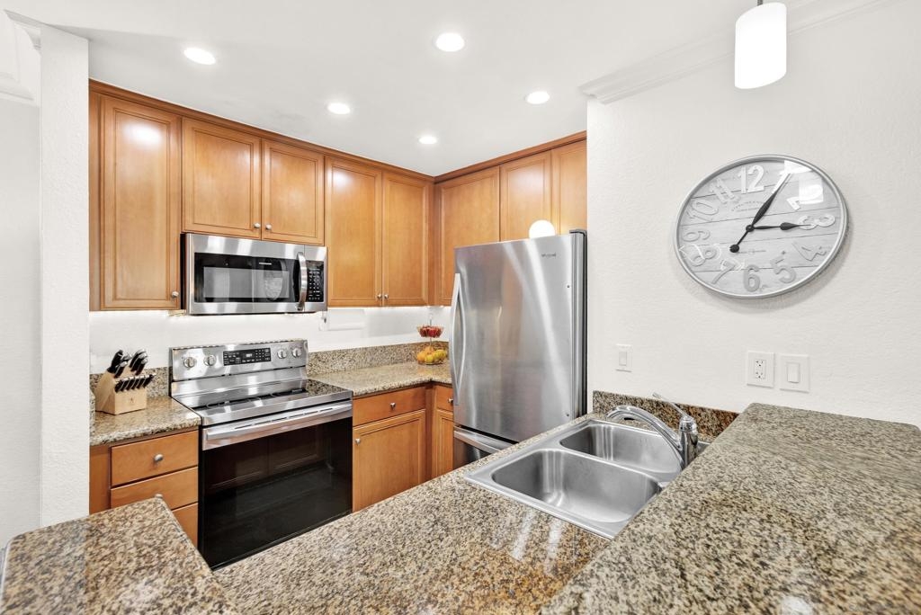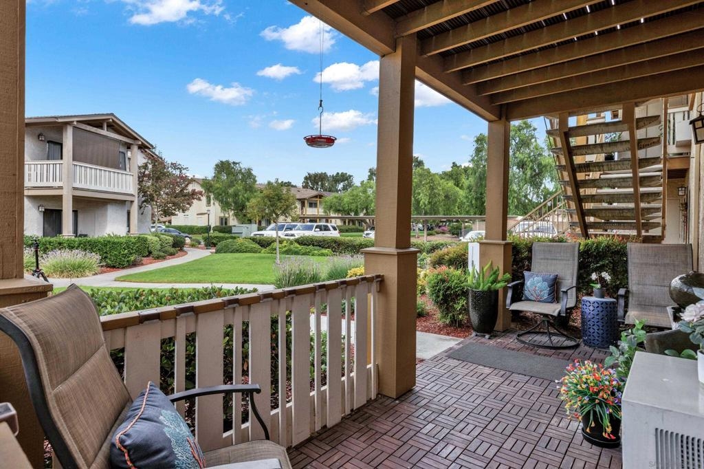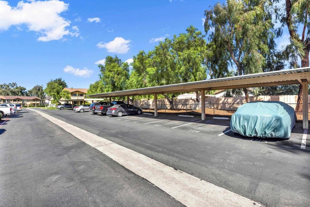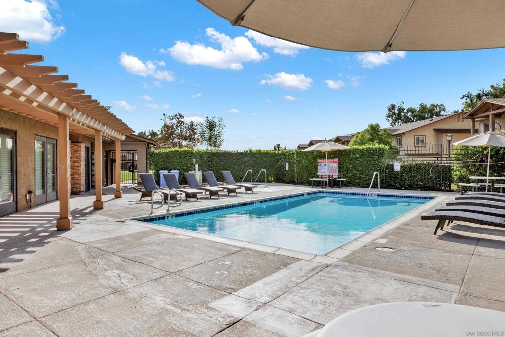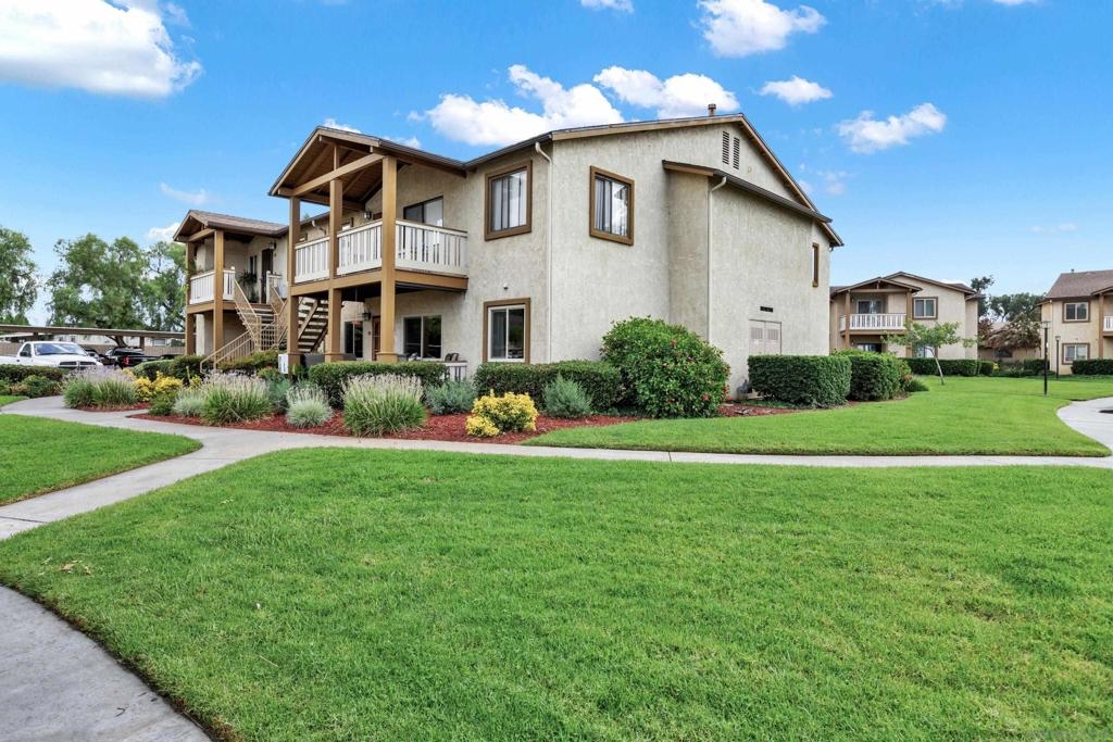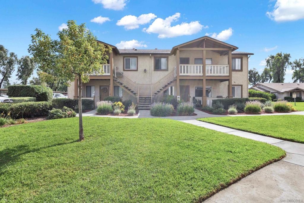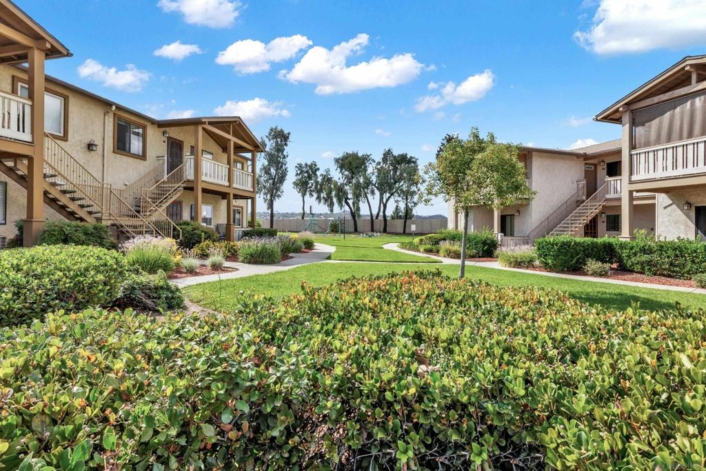Highly desirable Alder Woods complex easy access to the HWY 67 and 52. HWY. Bottom floor corner unit. Owner updated. New windows, top down/bottom up blinds, impressive Italian floor tiles 24"X48" dark gray. Primary bathroom has 24"X48" white tiles vertically set with an alcove, the shower floor is black pebble, shower door is custom built. Both bathrooms include 55" shower heads with time and temp displays and 4 water positions, both bathrooms have ceiling fans that have a white light and night lights and music. Both bathrooms have floating vanities with two drawers, porcelain top, chrome faucets and both bathrooms have new toilets. Second bathroom boasts 36"X18" light blue tile horizontally set, glass tile alcove with dimmable lighting, there is a jacuzzi bathtub with multi-function handheld shower head perfect for bathing children or pets. Inside laundry with full size stackable Samsung washer and dryer that convey with sale, room air conditioner/heater with a remote, granite countertops, stainless steel Samsung 30 inch electric range, fan convection cooking oven with smooth top cooktop, Bosch stainless steel dishwasher quiet 50dB, Frigidaire microwave oven is stainless steel, two new pendant lights over the breakfast bar, modern chandelier in the dining room. Ceiling fans in both bedrooms and living room with remotes. Bedrooms/bathrooms are on opposite sides of the condo with living in between. Two parking spots, one covered. Water and trash are included in the HOA. Pool, spa, club house, workout facility, gated community.