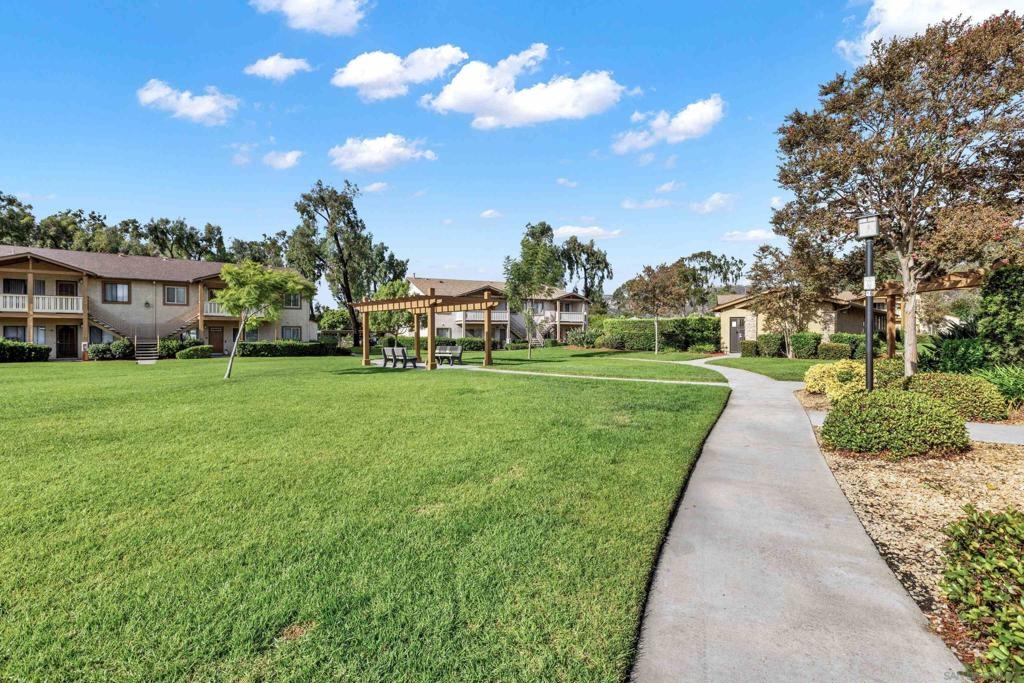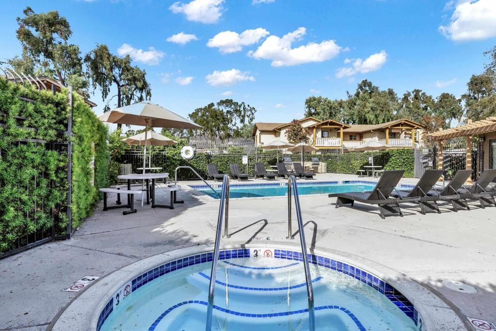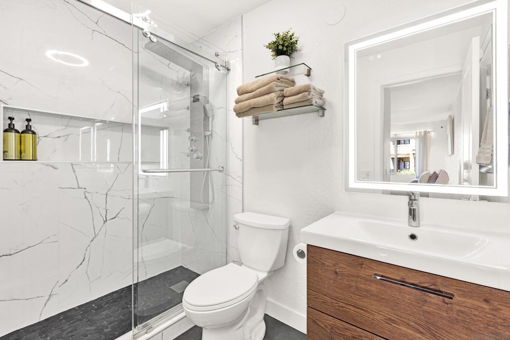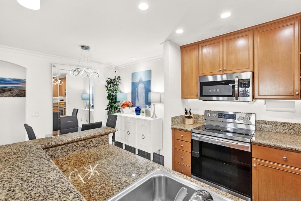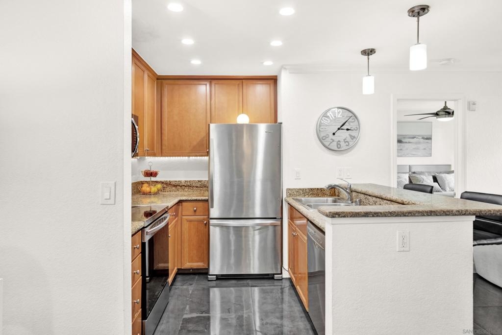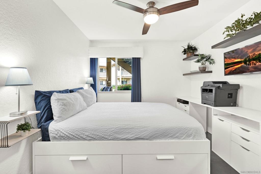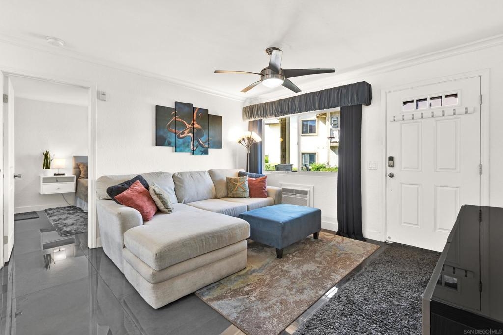 Highly desirable Alder Woods complex easy access to the HWY 67 and 52. HWY. Bottom floor corner unit. Owner updated. New windows, top down/bottom up blinds, impressive Italian floor tiles 24"X48" dark gray. Primary bathroom has 24"X48" white tiles vertically set with an alcove, the shower floor is black pebble, shower door is custom built. Both bathrooms include 55" shower heads with time and temp displays and 4 water positions, both bathrooms have ceiling fans that have a white light and night lights and music. Both bathrooms have floating vanities with two drawers, porcelain top, chrome faucets and both bathrooms have new toilets. Second bathroom boasts 36"X18" light blue tile horizontally set, glass tile alcove with dimmable lighting, there is a jacuzzi bathtub with multi-function handheld shower head perfect for bathing children or pets. Inside laundry with full size stackable Samsung washer and dryer that convey with sale, room air conditioner/heater with a remote, granite countertops, stainless steel Samsung 30 inch electric range, fan convection cooking oven with smooth top cooktop, Bosch stainless steel dishwasher quiet 50dB, Frigidaire microwave oven is stainless steel, two new pendant lights over the breakfast bar, modern chandelier in the dining room. Ceiling fans in both bedrooms and living room with remotes. Bedrooms/bathrooms are on opposite sides of the condo with living in between. Two parking spots, one covered. Water and trash are included in the HOA. Pool, spa, club house, workout facility, gated community.
