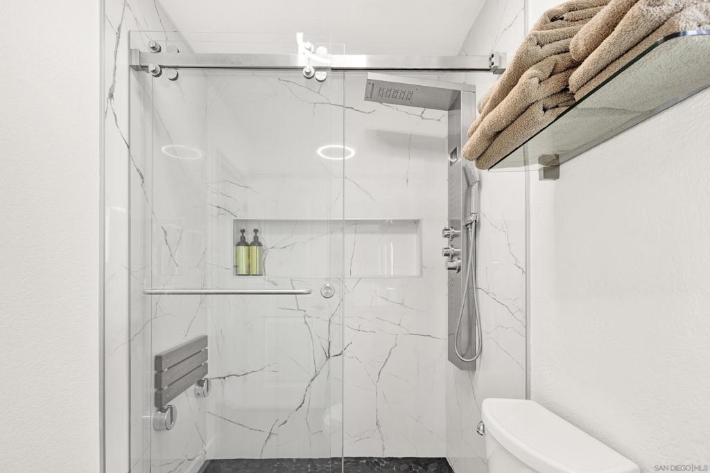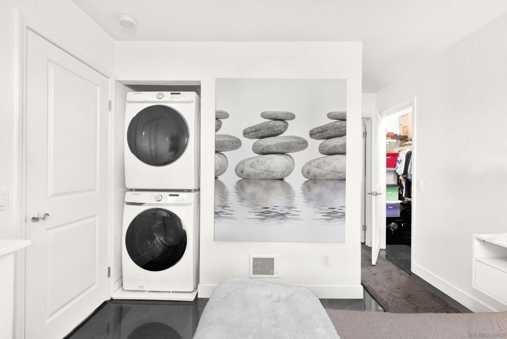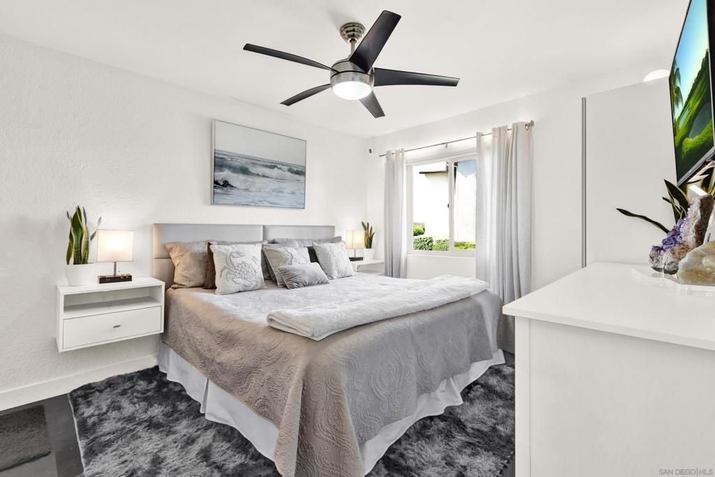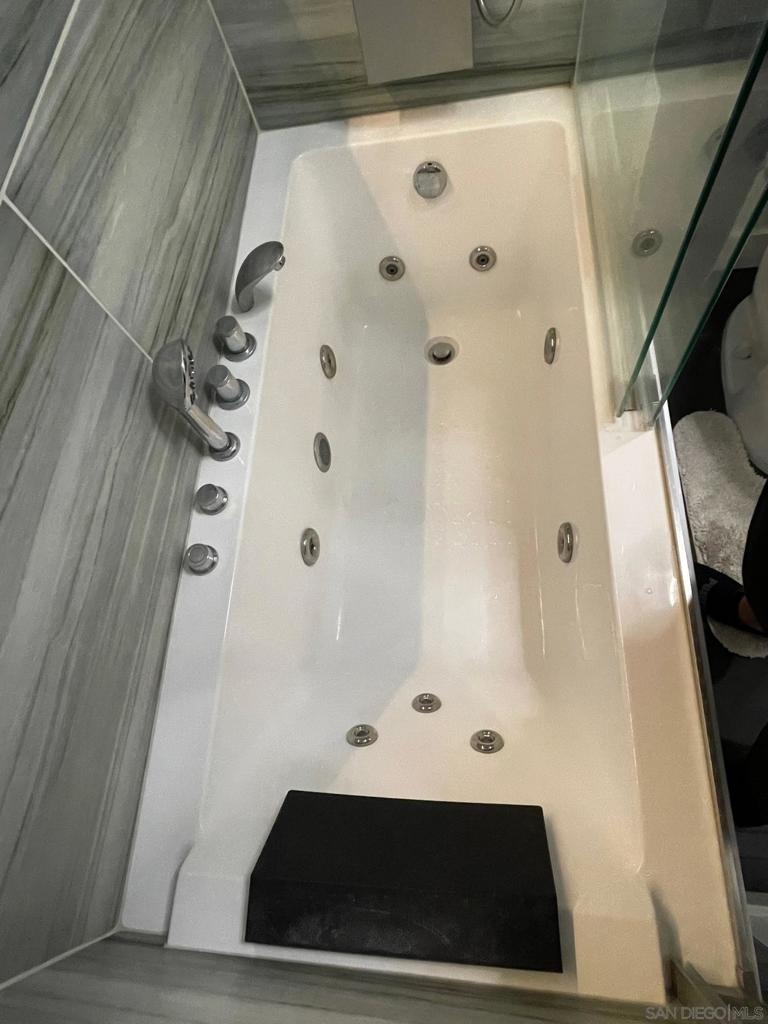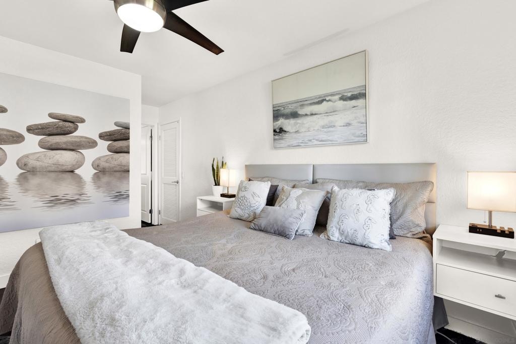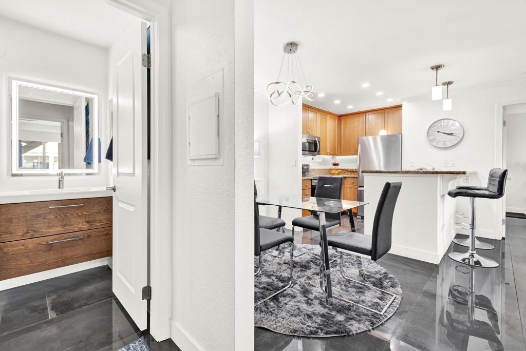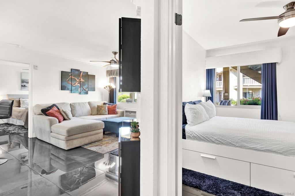Highly desirable Alder Woods complex easy access to the HWY 67 and 52. HWY. Bottom floor corner unit. Owner updated. New windows, top down/bottom up blinds, impressive Italian floor tiles 24"X48" dark gray. Primary bathroom has 24"X48" white tiles vertically set with an alcove, the shower floor is black pebble, shower door is custom built. Both bathrooms include 55" shower heads with time and temp displays and 4 water positions, both bathrooms have ceiling fans that have a white light and night lights and music. Both bathrooms have floating vanities with two drawers, porcelain top, chrome faucets and both bathrooms have new toilets. Second bathroom boasts 36"X18" light blue tile horizontally set, glass tile alcove with dimmable lighting, there is a jacuzzi bathtub with multi-function handheld shower head perfect for bathing children or pets. Inside laundry with full size stackable Samsung washer and dryer that convey with sale, room air conditioner/heater with a remote, granite countertops, stainless steel Samsung 30 inch electric range, fan convection cooking oven with smooth top cooktop, Bosch stainless steel dishwasher quiet 50dB, Frigidaire microwave oven is stainless steel, two new pendant lights over the breakfast bar, modern chandelier in the dining room. Ceiling fans in both bedrooms and living room with remotes. Bedrooms/bathrooms are on opposite sides of the condo with living in between. Two parking spots, one covered. Water and trash are included in the HOA. Pool, spa, club house, workout facility, gated community.