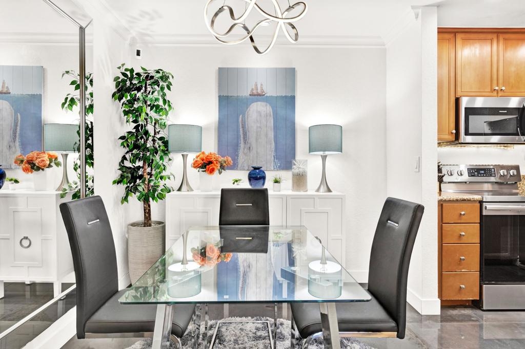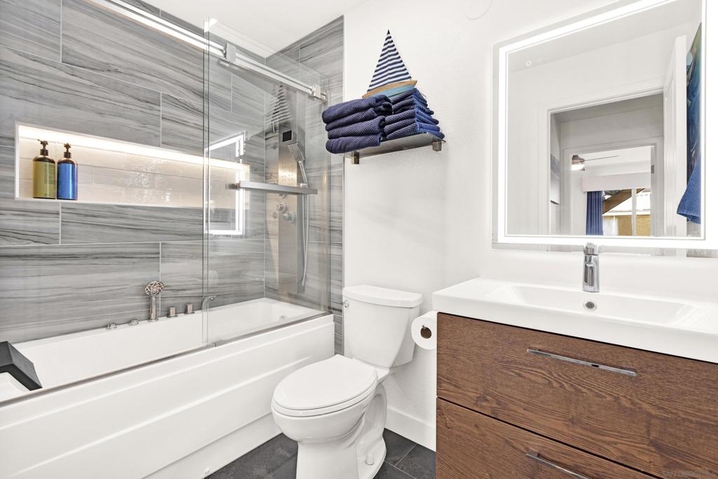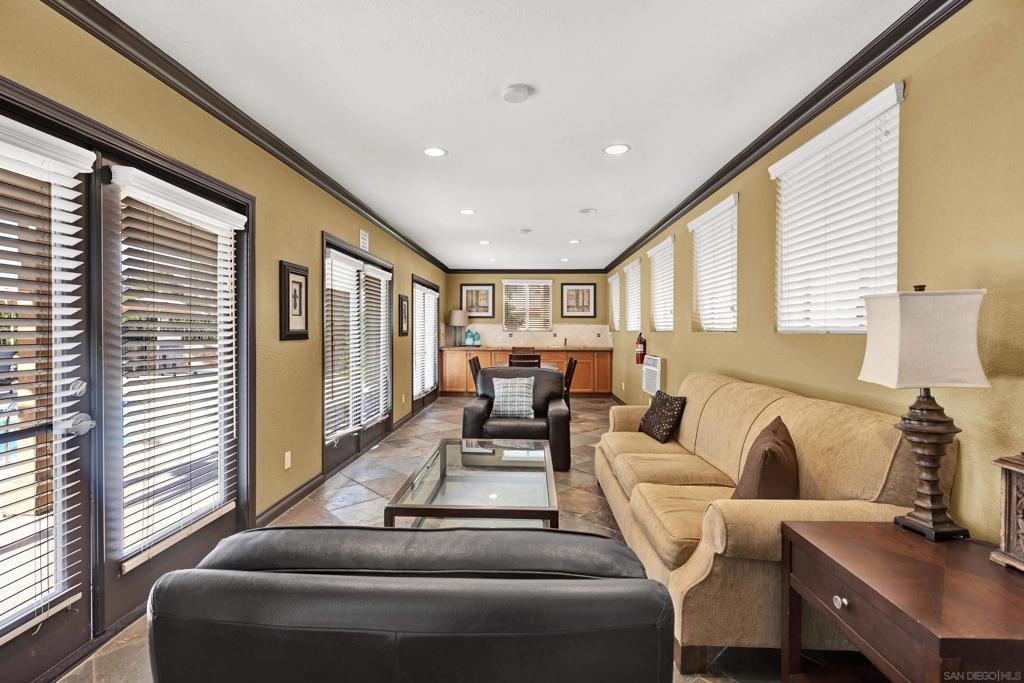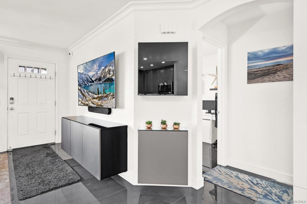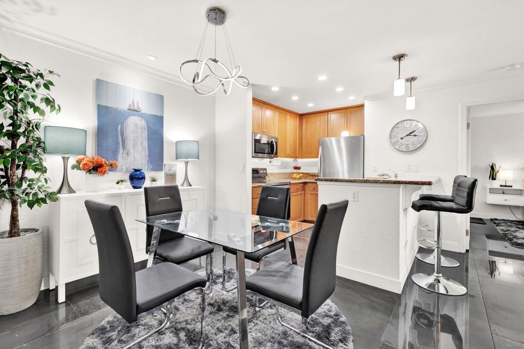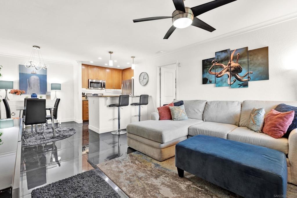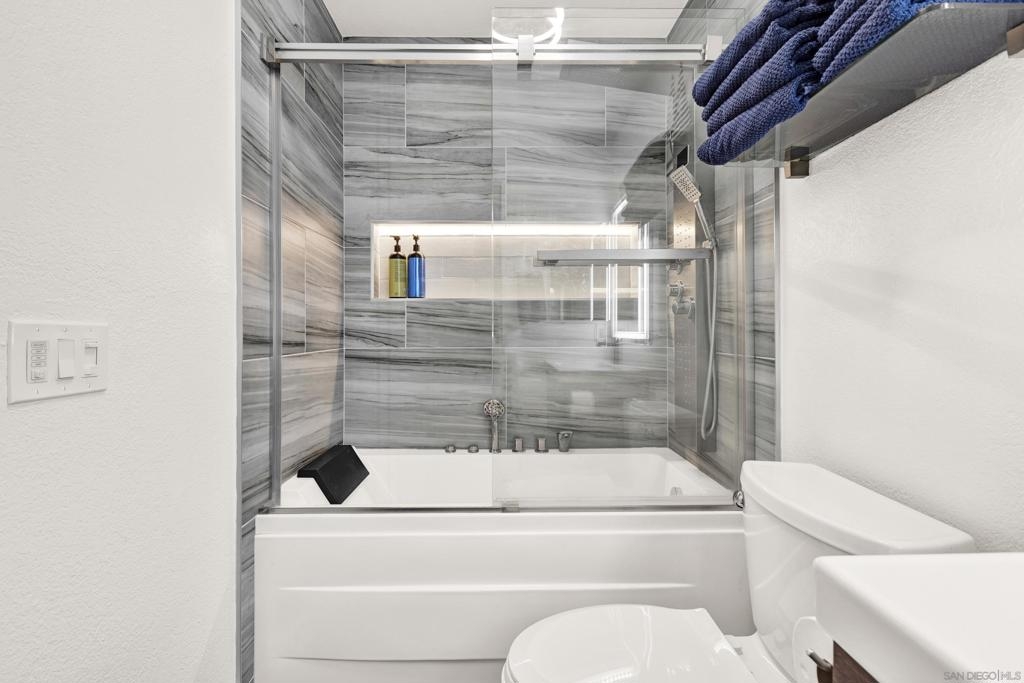 Highly desirable Alder Woods complex easy access to the HWY 67 and 52. HWY. Bottom floor corner unit. Owner updated. New windows, top down/bottom up blinds, impressive Italian floor tiles 24"X48" dark gray. Primary bathroom has 24"X48" white tiles vertically set with an alcove, the shower floor is black pebble, shower door is custom built. Both bathrooms include 55" shower heads with time and temp displays and 4 water positions, both bathrooms have ceiling fans that have a white light and night lights and music. Both bathrooms have floating vanities with two drawers, porcelain top, chrome faucets and both bathrooms have new toilets. Second bathroom boasts 36"X18" light blue tile horizontally set, glass tile alcove with dimmable lighting, there is a jacuzzi bathtub with multi-function handheld shower head perfect for bathing children or pets. Inside laundry with full size stackable Samsung washer and dryer that convey with sale, room air conditioner/heater with a remote, granite countertops, stainless steel Samsung 30 inch electric range, fan convection cooking oven with smooth top cooktop, Bosch stainless steel dishwasher quiet 50dB, Frigidaire microwave oven is stainless steel, two new pendant lights over the breakfast bar, modern chandelier in the dining room. Ceiling fans in both bedrooms and living room with remotes. Bedrooms/bathrooms are on opposite sides of the condo with living in between. Two parking spots, one covered. Water and trash are included in the HOA. Pool, spa, club house, workout facility, gated community.