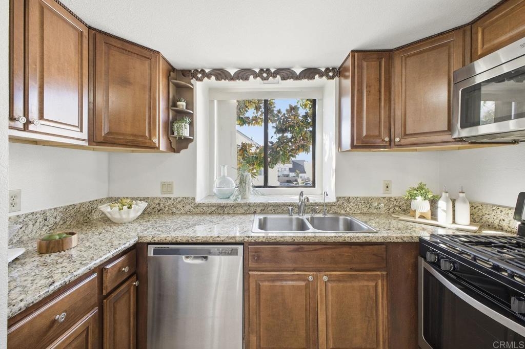 Welcome to this light and bright 2-bedroom, 2-bath corner unit located in the desirable Granite Hills community. This 1,087 sq ft condo features an open floor plan with high ceilings, wood flooring, and abundant natural light throughout. The kitchen offers stainless steel appliances and granite countertops, seamlessly connecting to the dining and living areas. Enjoy a private balcony perfect for relaxing or outdoor dining. Additional features include an attached garage with laundry, plus an extra parking space. The well-maintained community offers a pool for residents to enjoy. Ideally situated near parks, schools, shopping, and dining, this home provides both comfort and convenience in a sought-after location.