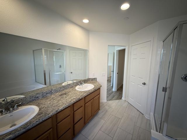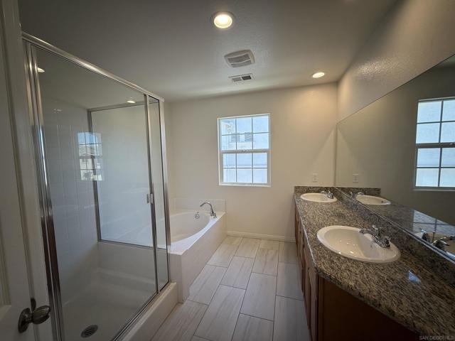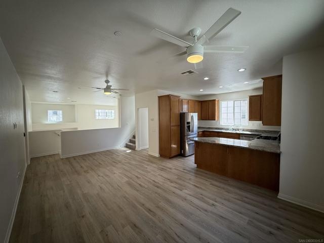 Luxurious Turn-Key Row Home in the prestigious gated community of Park Avenue Homes. This stunning tri-level END UNIT feels like a single-family home with 3 bedrooms, 2.5 baths, 1,865 square feet. The first floor greets you with a spacious living room featuring soaring cathedral ceilings and expansive windows, flooding the space with natural light. On the second level, you'll find an open-concept kitchen boasting ample storage, beautiful wood cabinets, sleek stainless-steel appliances, granite countertops, and a convenient breakfast bar. The generously sized bedrooms are located on the top floor, offering privacy and comfort. The primary bedroom boasts a large walk-in closet, ensuite bath complete with a soaking tub, dual vanities & separate shower. Additional amenities of this great home include: connections for in unit stacked Washer & Dryer, Attached 2 car garage, LOW HOA fees & secured gated community that is FHA & VA Approved! Centrally located in the heart of El Cajon with Easy access to both Hwy 67 & I-8, Near the MTS & Trolley and all that downtown has to offer including dinning, shopping and more. *NOTE* Park Avenue Homes are Row Homes and not Townhomes: the difference is that though these look attached, there is a constructed gap between each home, so there are no common walls, and title is issued as a single-family home.