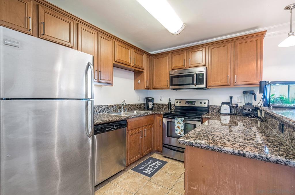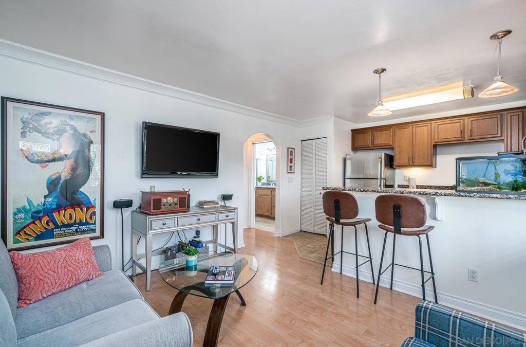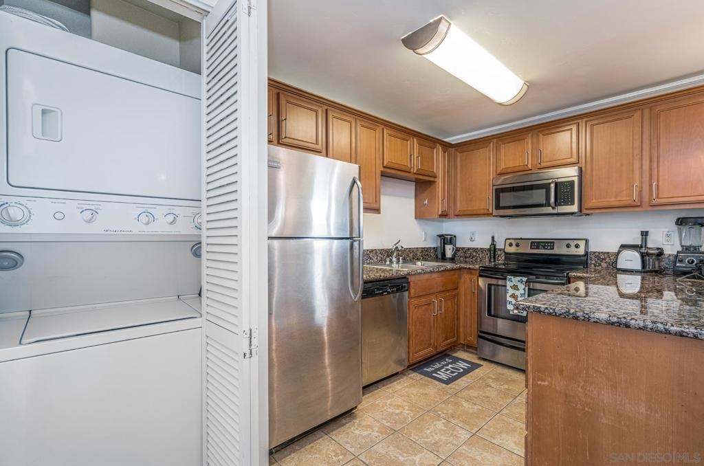 Welcome Home to your beautiful 1-Bed 1-Bath condo in a gated community! Light & bright floorplan features hickory pine flooring, crown molding, breakfast bar w/ granite counters & pendant lights, SS appliances, rich cabinetry, neutral color palette, ceiling fan, mirrored closet doors, In-Unit Laundry & assigned parking space. Complex feels like tropical oasis with lush landscaping, sparkling pool & BBQ area plus Gym! Low HOA! VA approved complex! Central location close shopping centers and freeway. Must See! Complex Features: ,,,, Equipment: Dryer,Garage Door Opener, Washer Sewer: Sewer Connected, Public Sewer Topography: LL